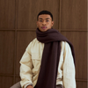 A super-soft brushed scarf in deep sea kelp green. Oversized with a thick, cozy texture and long fringe to wrap up in. Made from recycled fibers and brushed to a cloudlike finish.